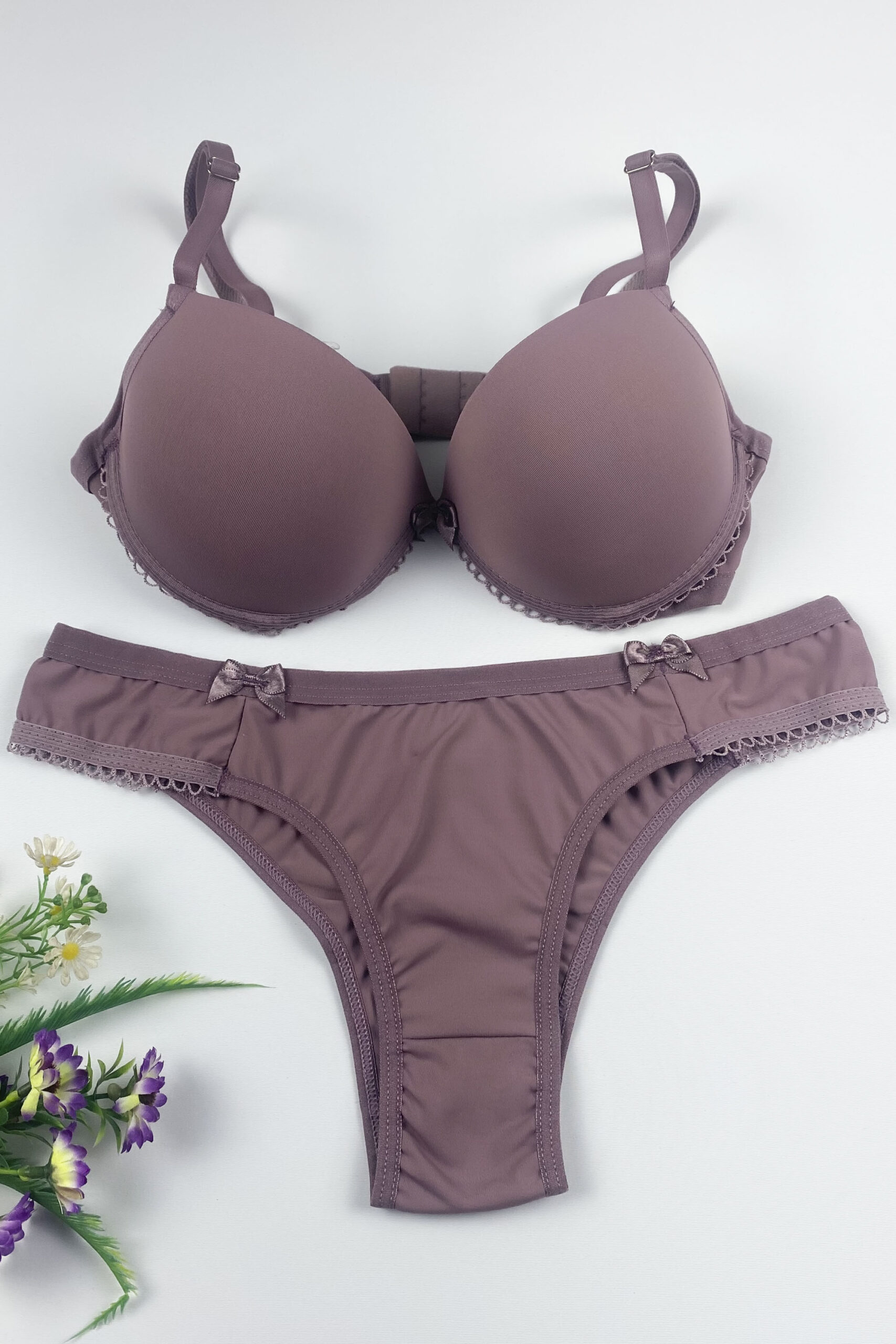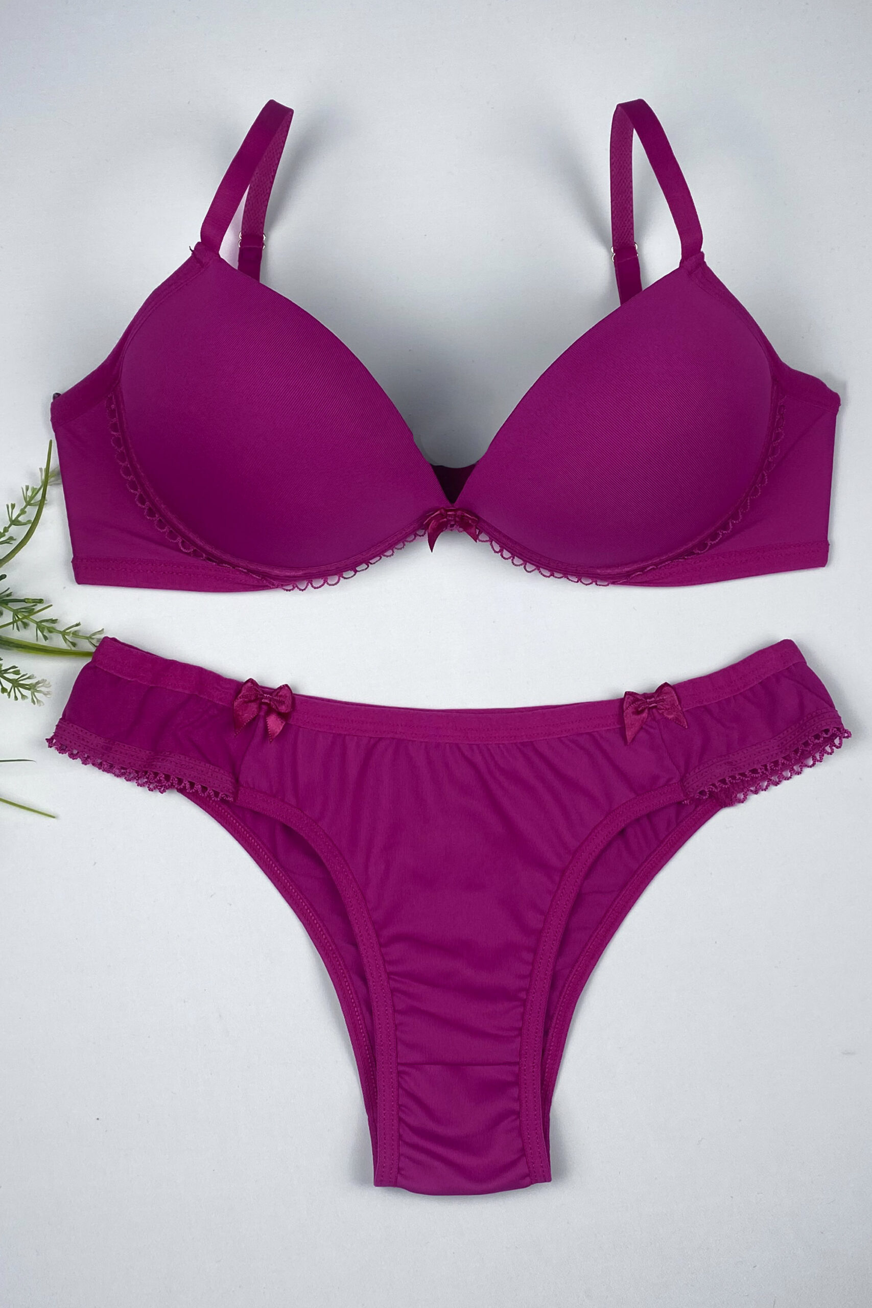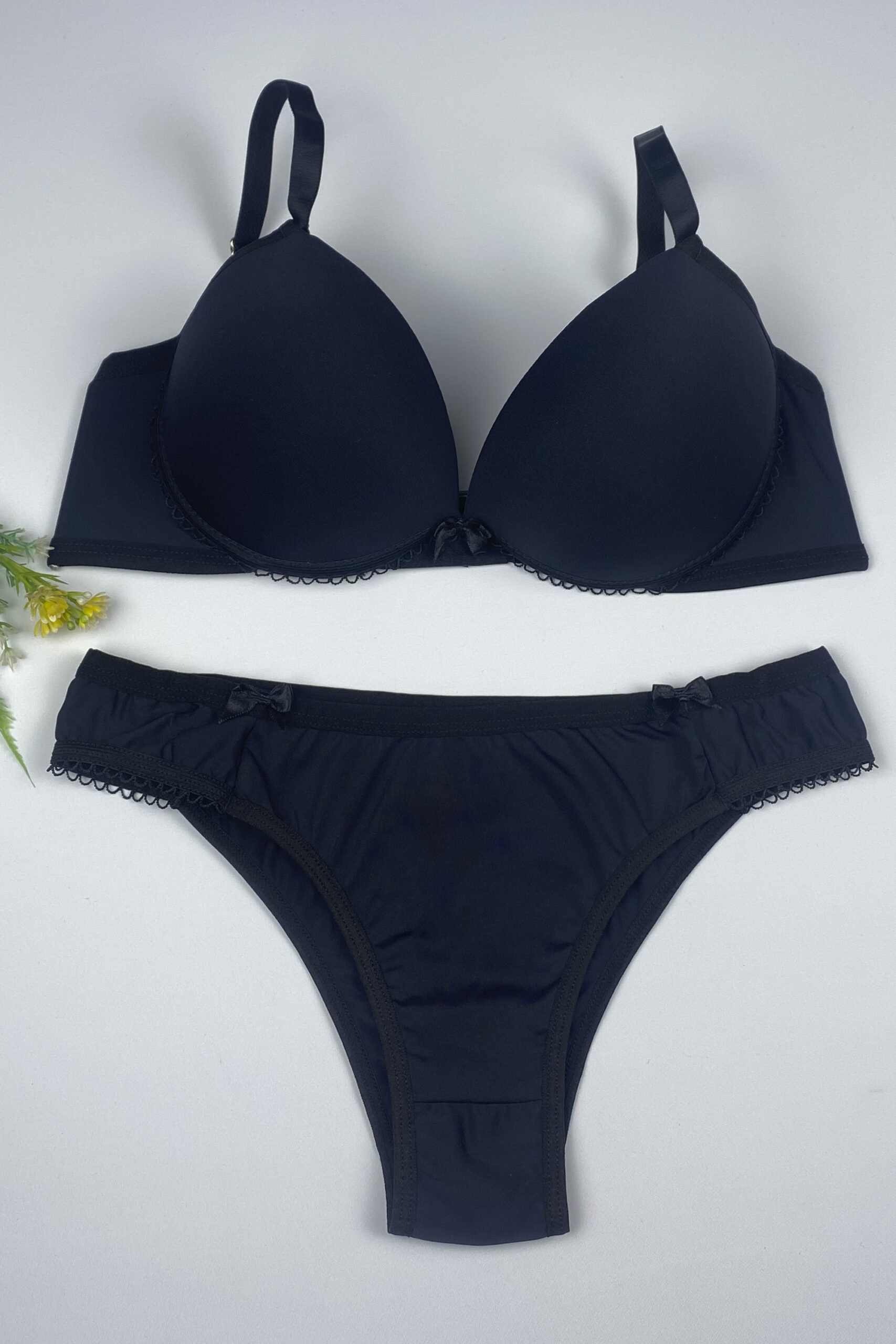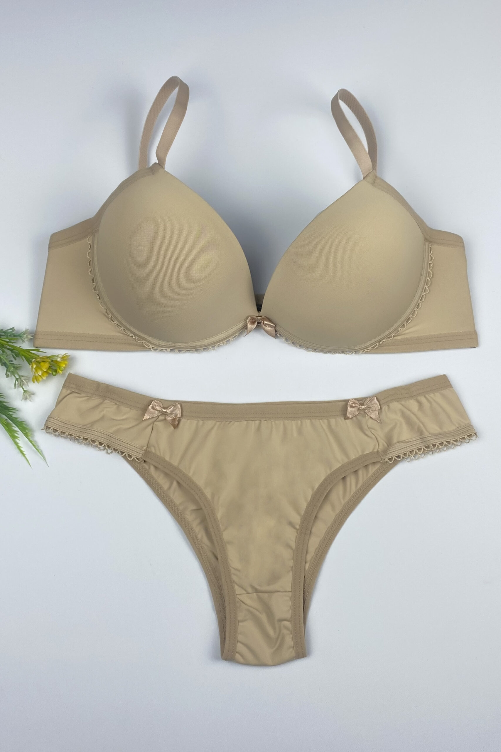 Sutiã com bojo e aro, confeccionado em microfibra de poliamida, com detalhe de laço entre os seios, fecho de dois ganchos. A calcinha modelo tanga, com laços em cetim nas laterais.